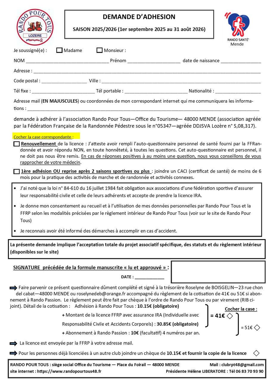 La demande doit être accompagnée d'un certificat médical mentionnant l'absence de contre-indications à la pratique de la randonnée.
